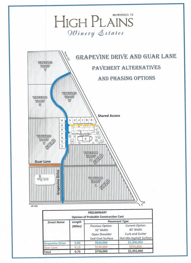 Kerry Miller from Kimley-Horn, the design consulting firm working on the High Plains Winery Estates, reported that the estates have been replatted and parcel maps are being finished. The next step in the design process is to start looking at roadway coverings. Much discussion surrounded the estimates that ranged from $750,000 to about $1.5 million. If these coverings meet city standards, they will be maintained by the city. Miller plans to sit down with city officials to come to an agreement about what specifics are necessary to meet this criteria. The board also discussed the possibility of doing this project in phases and requested the Kimley-Horn research those cost and options.